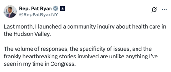 US Rep. Pat Ryan (D-NY) releases the results of a community inquiry into the business practices of Optum-owned medical practices in New York’s Hudson Valley, many of which detail the decline in care quality, provider accessibility, billing methods, and staff morale. Over a third of the 1,800 patients interviewed say they’ve experienced poor customer service experiences that have negatively impacted their care. UnitedHealth Group-owned Optum has acquired two of the area’s largest providers in the last several years, consolidating the market and options for patients.